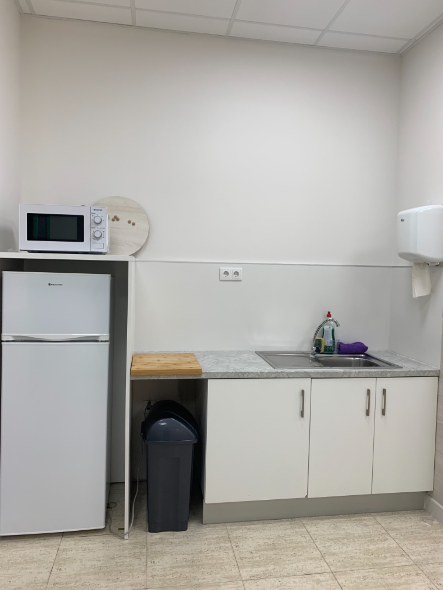 Un pequeño loft bien equipado con una pica con escurre platos, microondas, nevera/congelador ,cubo de basura, tablas de cortar y armarios donde encontraras los productos de limpieza entre otros productos.